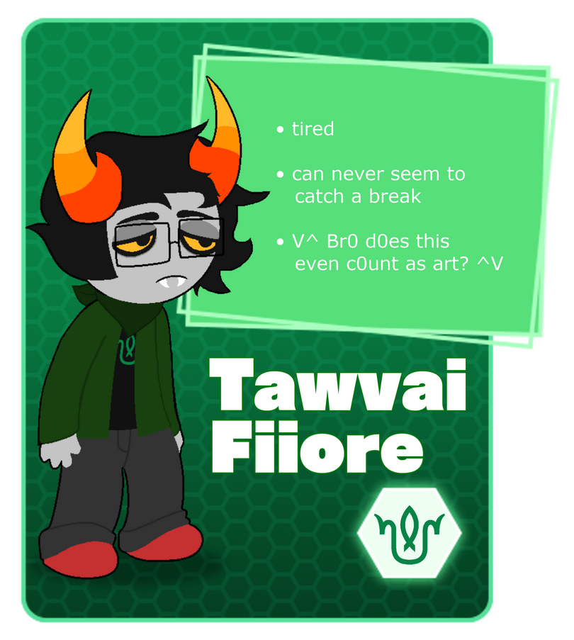 Taw ended up having a one sided flush crush on a Teal who took his feelings for granted and ultimately grabbed those red feelings and crushed them with their claws. He's stopped talking to them but he finds it hard to let go of this one particular troll, even though he can't remember anything about them these days. He's bitter and has a hard time trusting people due to his past.Since then, Taw has become much more distant, tired, and introverted as he grew up. He eventually settled down and became an artist, most of his income coming from commissions. He's found that he can make a few extra caegars by expanding his reach to a particular sort of... monster loving community on the internet.He shares a hive with Raziel, Tailes Marter, and Noxane Zolair.